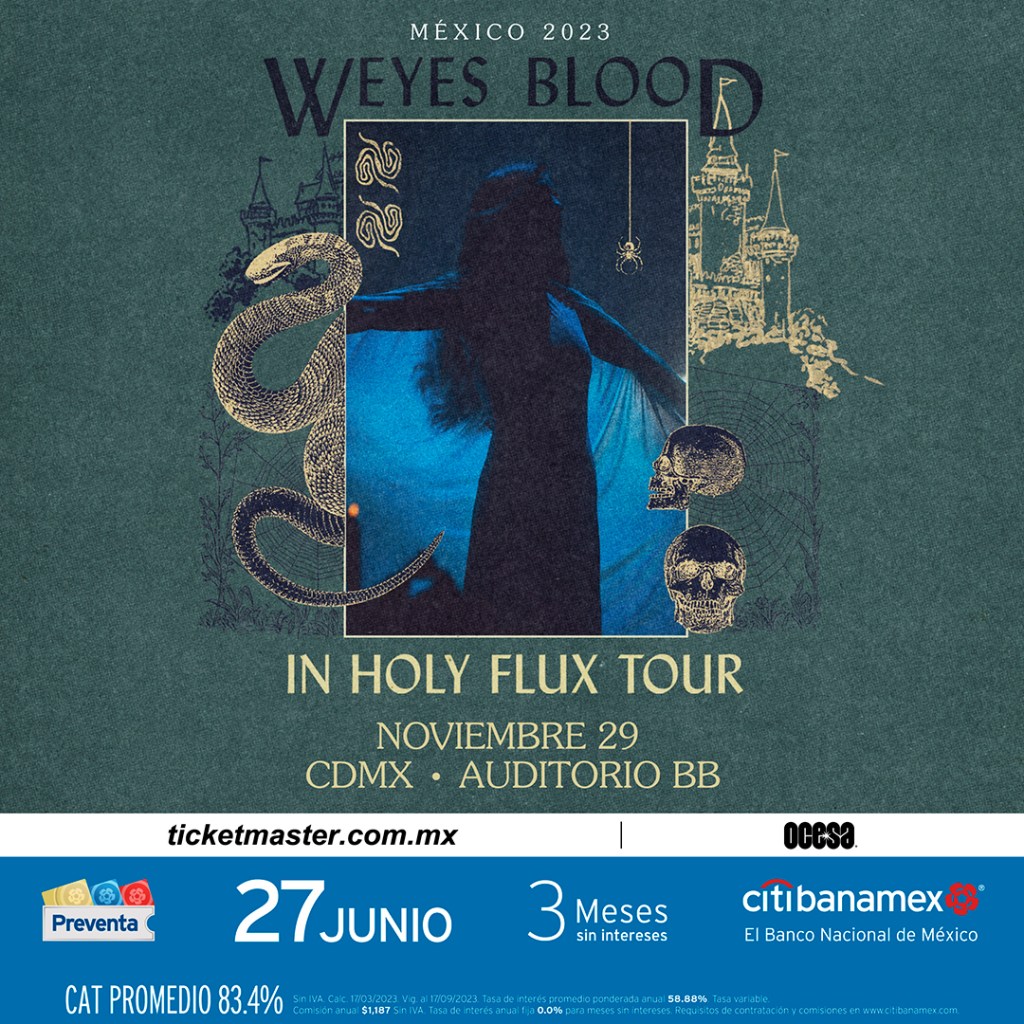 Luego de su paso por Alemania, Francia, Dinamarca, Suecia e Inglaterra, Weyes Blood llegará, por primera vez, a México, con In Holy Flux Tour. «Por fin… llevaremos este espectáculo tan brillante a México», escribió la artista, a través de sus redes sociales, cuyas melodías se expanden ante la suavidad de los sonidos y la fuerza de su voz.