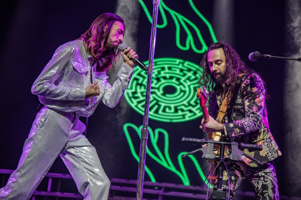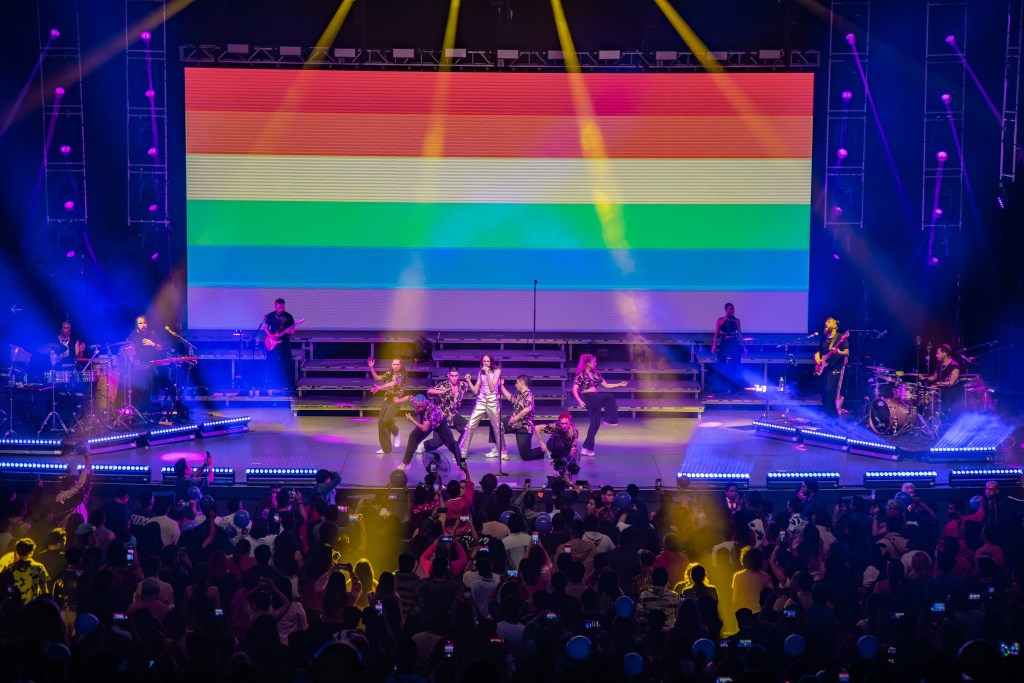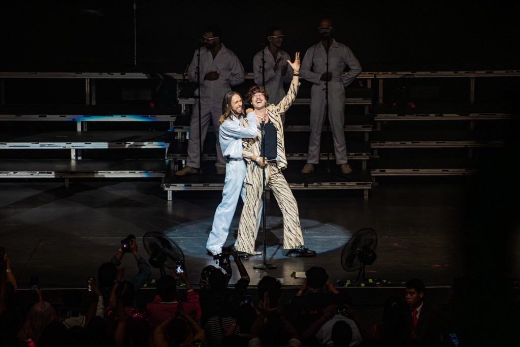 Los primeros acordes de “Amor libre” sonaron y el público levantó globos de colores sobre el aire. Una bandera multicolor se deslizó por las filas y Esteman la recibió con entusiasmo. “Juan y Paul”, canción que interpreta junto a Miranda!, resonó en el recinto y el público se puso a bailar. Más tarde, la nostalgia se hizo presente y Caloncho subió al escenario para cantar “Mar” con el colombiano.