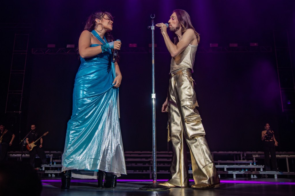 Minutos más tarde, apareció sobre una de las puertas del recinto junto a Daniela Spalla, y juntos cantaron “Besos y pendientes”. Una luz guió su camino de regreso al escenario y el público tomó la oportunidad para extenderles algunos presentes. Una vez que terminaron su recorrido, ambos interpretaron “Te alejas más de mí”, una de sus colaboraciones más populares.
