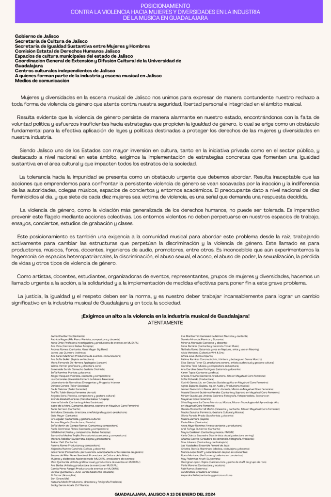 Ante la notable falta de medidas y acciones que propicien un ambiente seguro para las mujeres y las diversidades de la industria musical, más de 80 músicas, compositoras, instrumentistas, productoras, representantes, gestoras, docentes, cineastas, fotógrafas y artistas visuales, así como diversas colectivas y organizaciones, se posicionaron en contra de la violencia y la impunidad que persiste en sus espacios creativos y de trabajo.