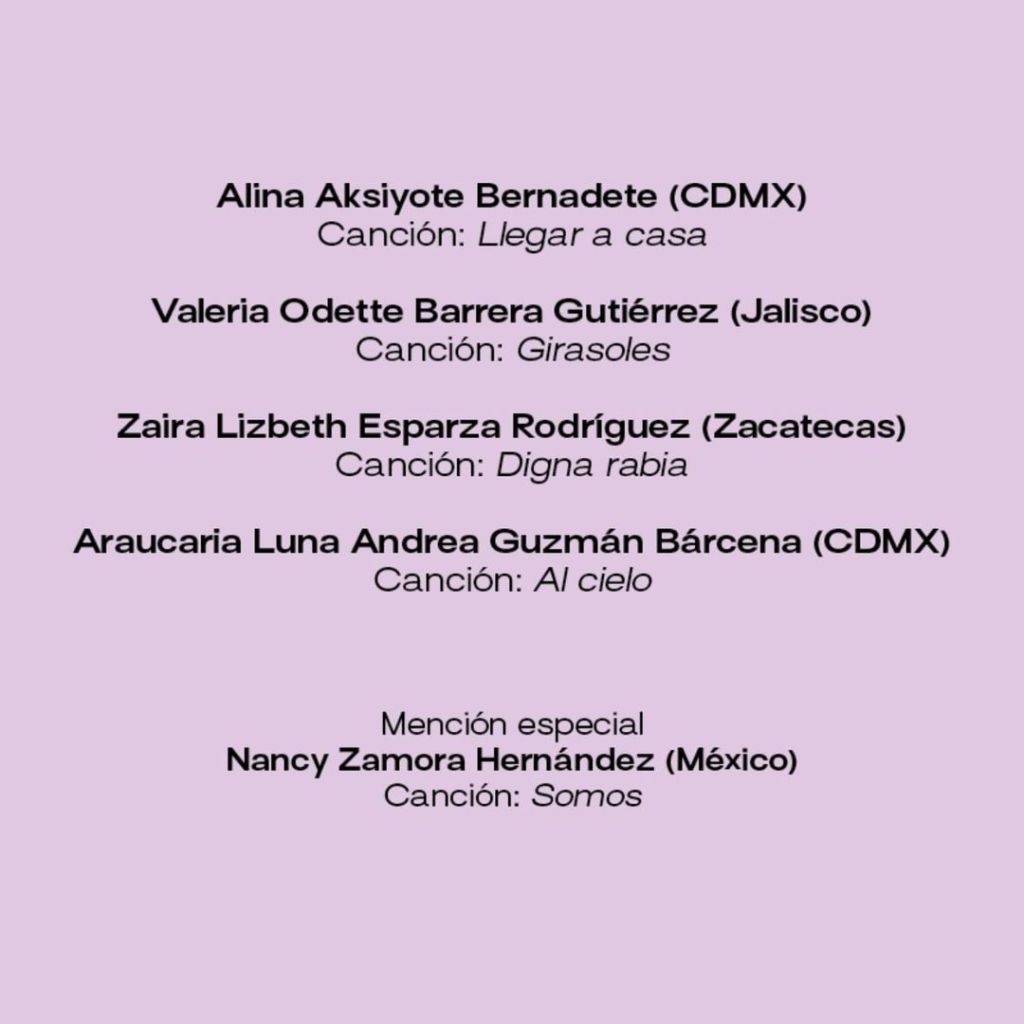 Con un jurado conformado por Lucía Álvarez (compositora y académica de la Facultad de Música de la UNAM), Lucía Anaya (Derretida) y Carla Reina (Niña Dioz), se dieron a conocer las finalistas del 2024, este año se seleccionaron cuatro propuestas: